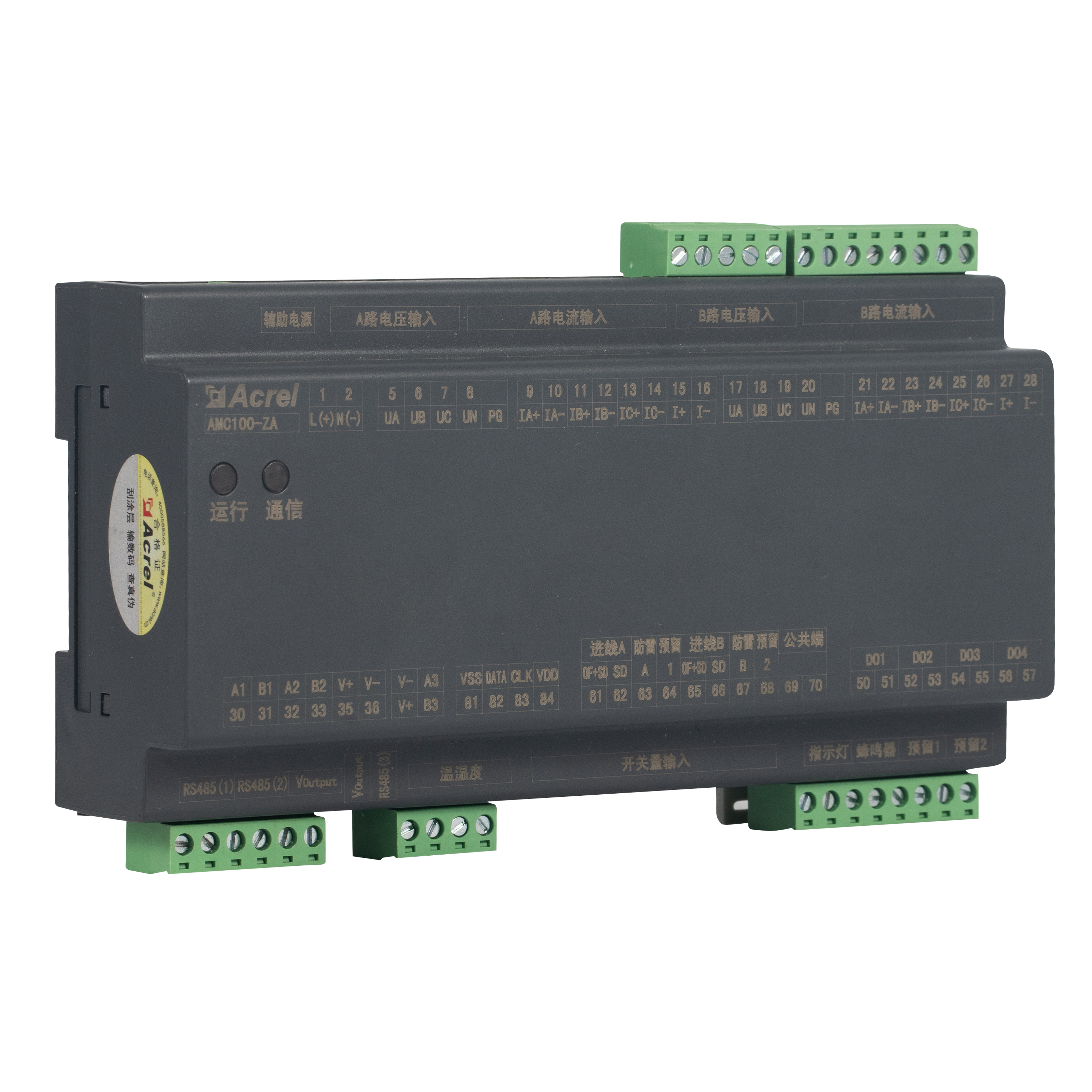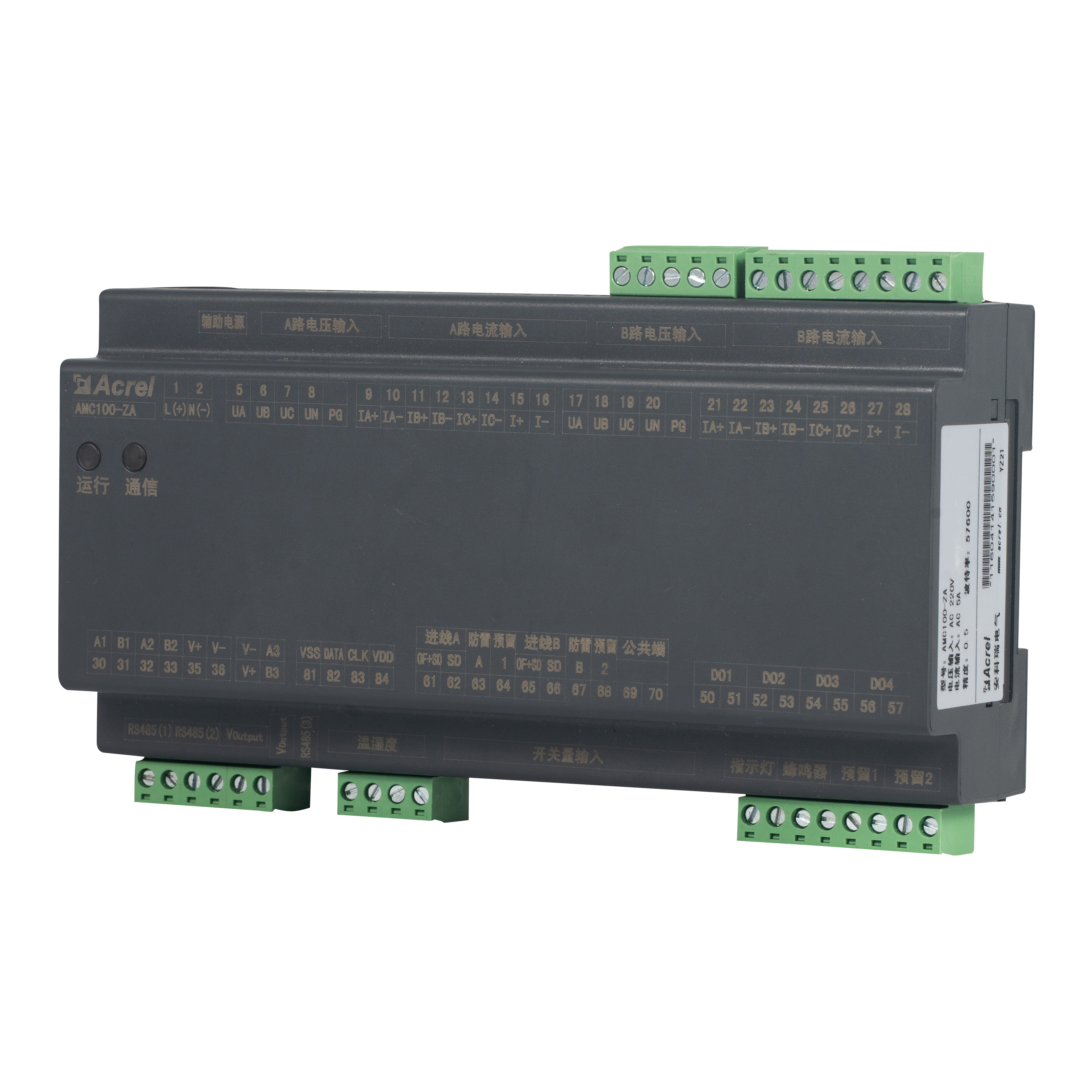 AMC100-ZA er Acrels DIN-skinne AC præcision strømfordelingsovervågningsenhed konstrueret til datacenterserverracks. Den sporer samtidig fulde elektriske parametre for A B dobbelte trefasede feeds, 192 udgående kredsløb, 8 DI / 4 DO statuspunkter, 2 lækagekanaler, 1 temperatur-fugtighedssensor og 63 harmoniske. Tre RS485 Modbus-RTU-porte muliggør sømløs BMS/DCIM-integration. Kompakt 180 mm hus, ±0,5 % nøjagtighed, alarmtærskler pr. kanal og øjeblikkelig lyd-lys-advarsel reducerer energispild og nedetid, hvilket gør det til det skalerbare hjerte i grønne datacenter AC-busway- eller PDU-overvågningsløsninger.