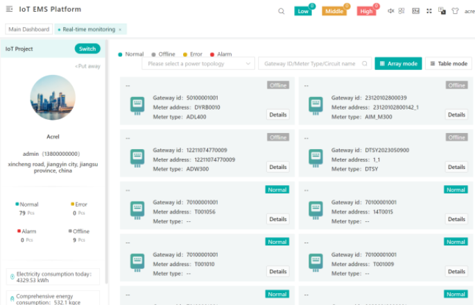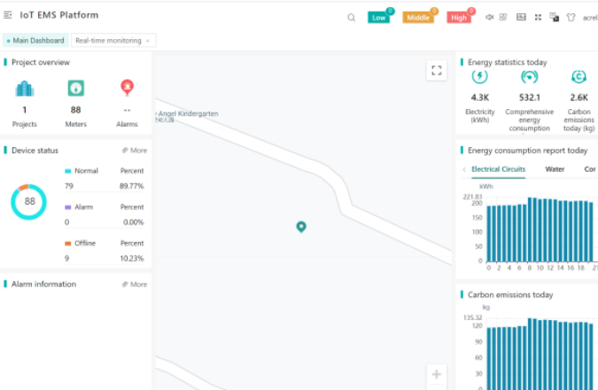 Projektprodukter: ADW210 Multi-kredsløb IoT Smart Energy Meter, ADW300 IoT 3-faset trådløs Smart Energy Meter, ADL400 Tre-faset DIN Rail Energy Meter, AWT100 IoT Smart Gateway, Acrel IoT-EMS Platform