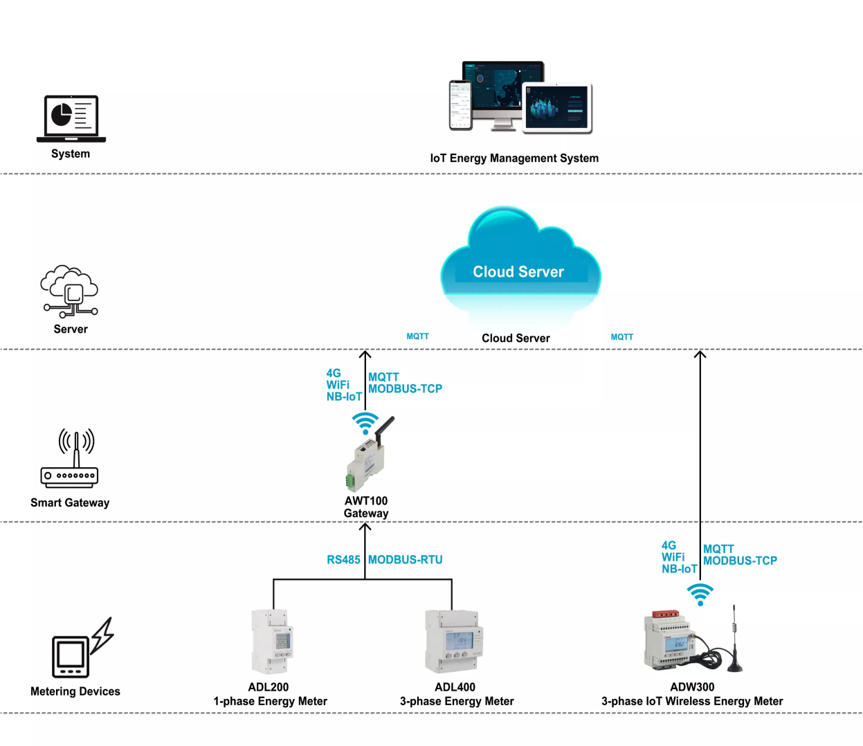 | ADW300 | ADW300 trådløs måler bruges hovedsageligt til at måle den trefasede aktive effekt af et lavspændingsnetværk. Den har RS485-kommunikation og WiFi/4G/Ethernet/LoRa trådløs kommunikationsfunktioner, hvilket er praktisk for brugerne at overvåge, læse og administrere elforbruget. Den kan monteres fleksibelt i fordelerboksen for at opnå undervareeffektmåling, statistik og analyse af forskellige områder og forskellige belastninger. | |